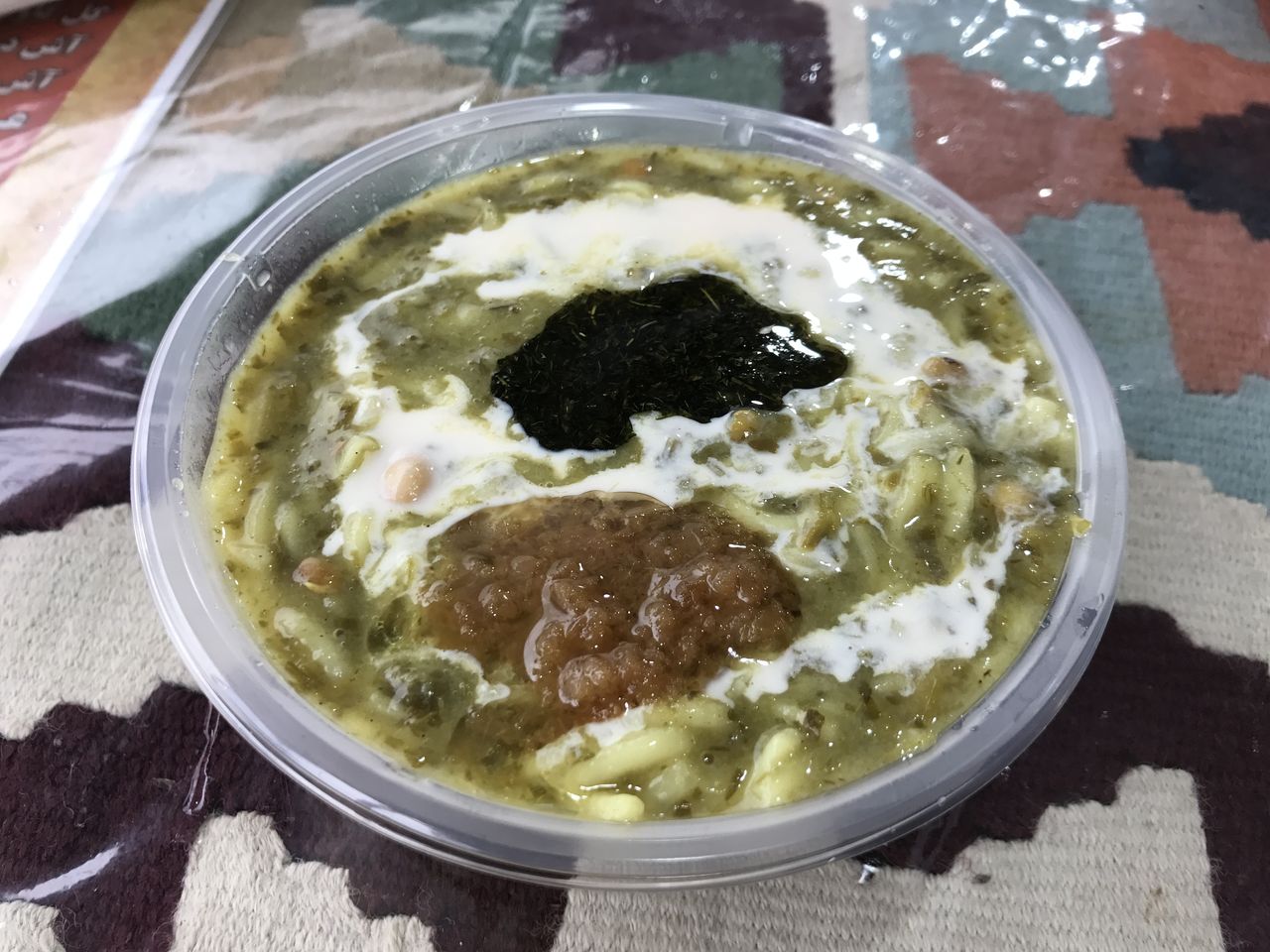 これは、アーシュレシュテという、豆と細麺をスパイスで煮込んでヨーグルトをかけた料理ですね。これ食べて10分後に腹壊しました。