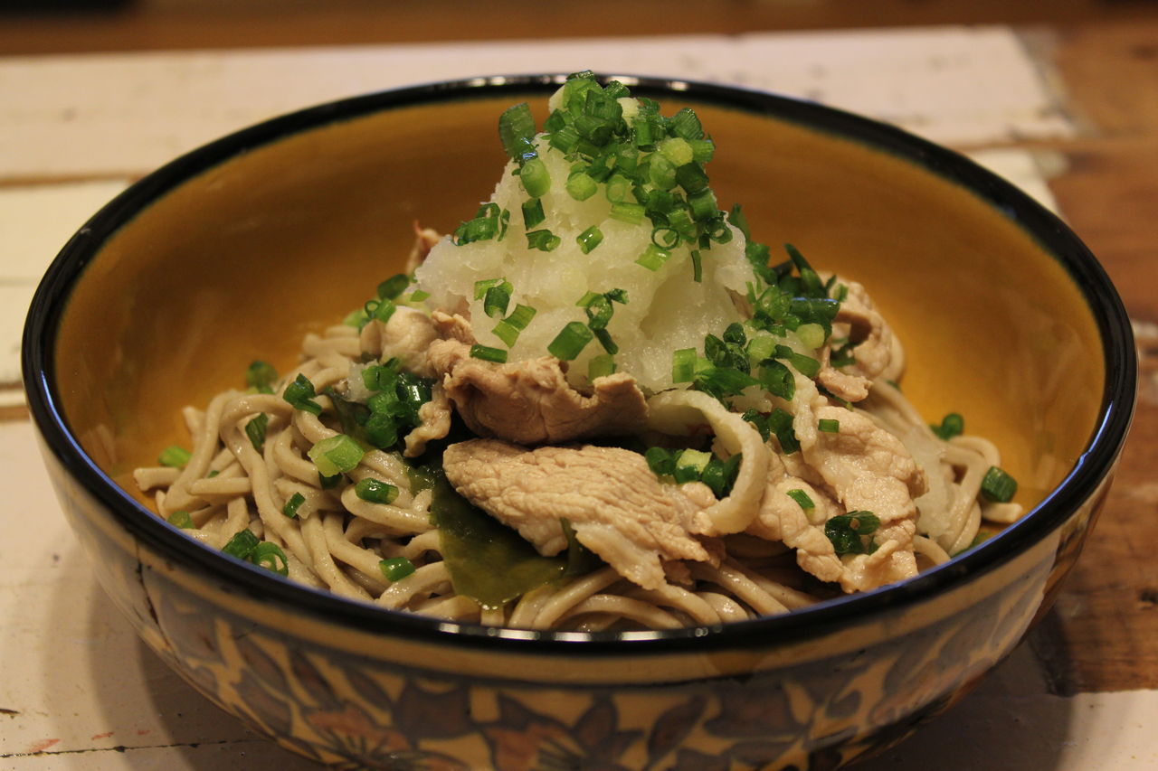 3.そばを水でよく〆る。器にそば、わかめ、にく、おろし、ねぎと盛り、つゆをかけて完成。
