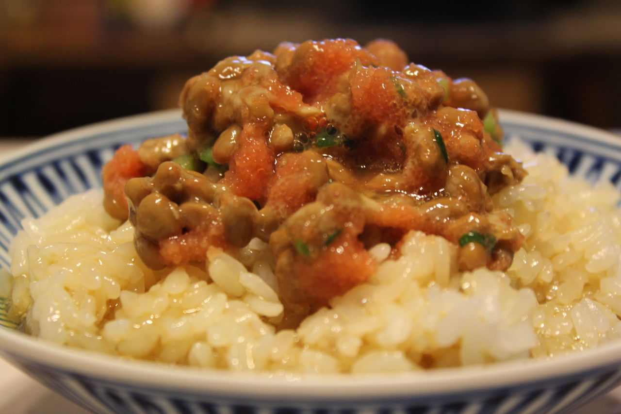 2.明太子と納豆とねぎを混ぜてごはんにのせる。