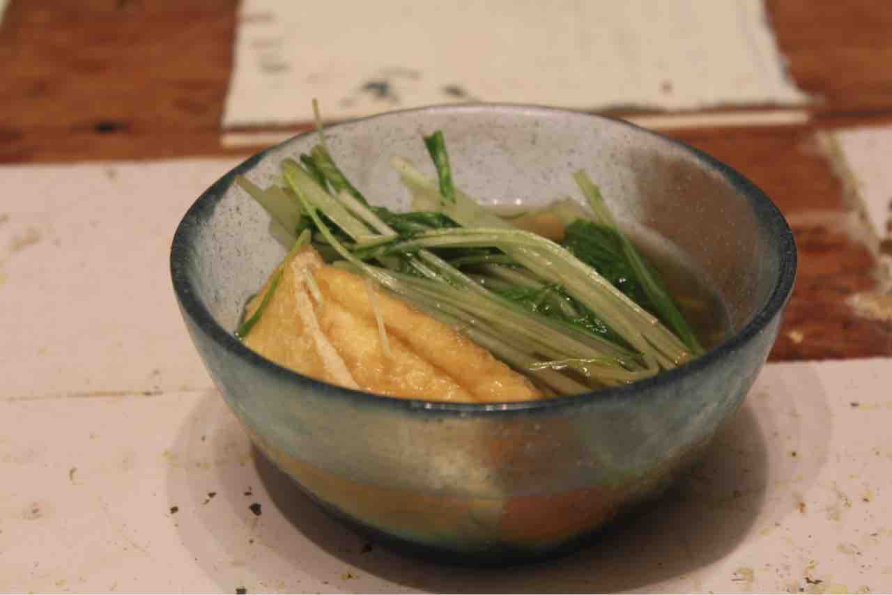 1.水菜は根元を落として、1/3に切りそろえる。油揚げは0.7-8cm幅に切る。