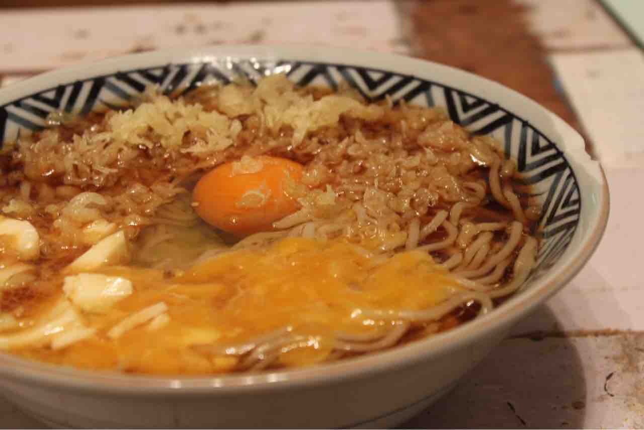 2.湯がいた蕎麦、チーズ、揚げ玉、卵をのせる。