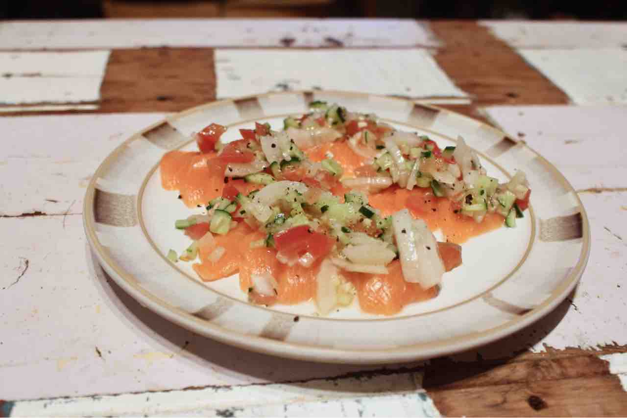 3.サーモンをスライスし、(2)をのせ、黒こしょうを挽く。