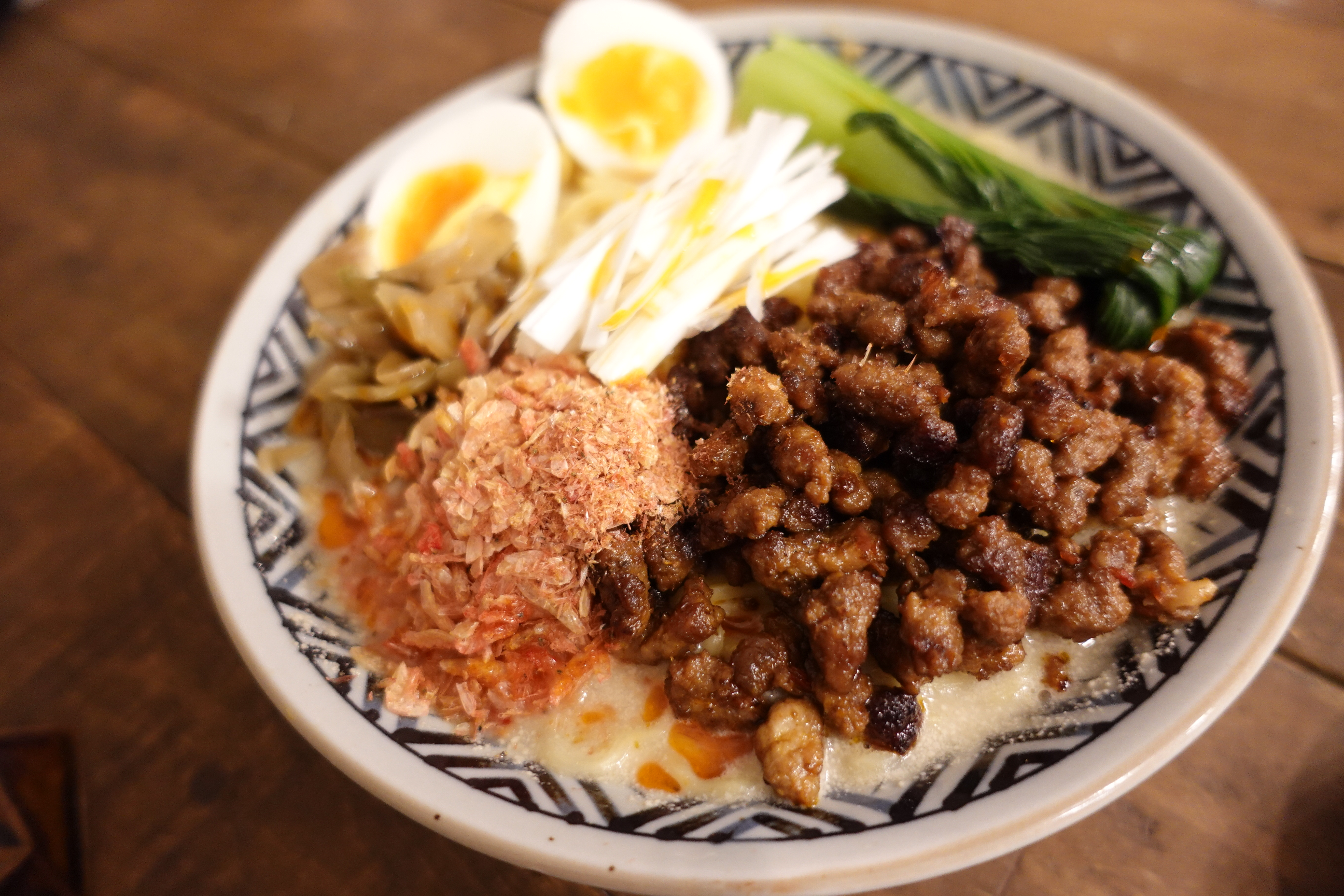 3.丼に(*)をあわせ、湯切りした麺を入れ、(1)、(2)をのせる。
