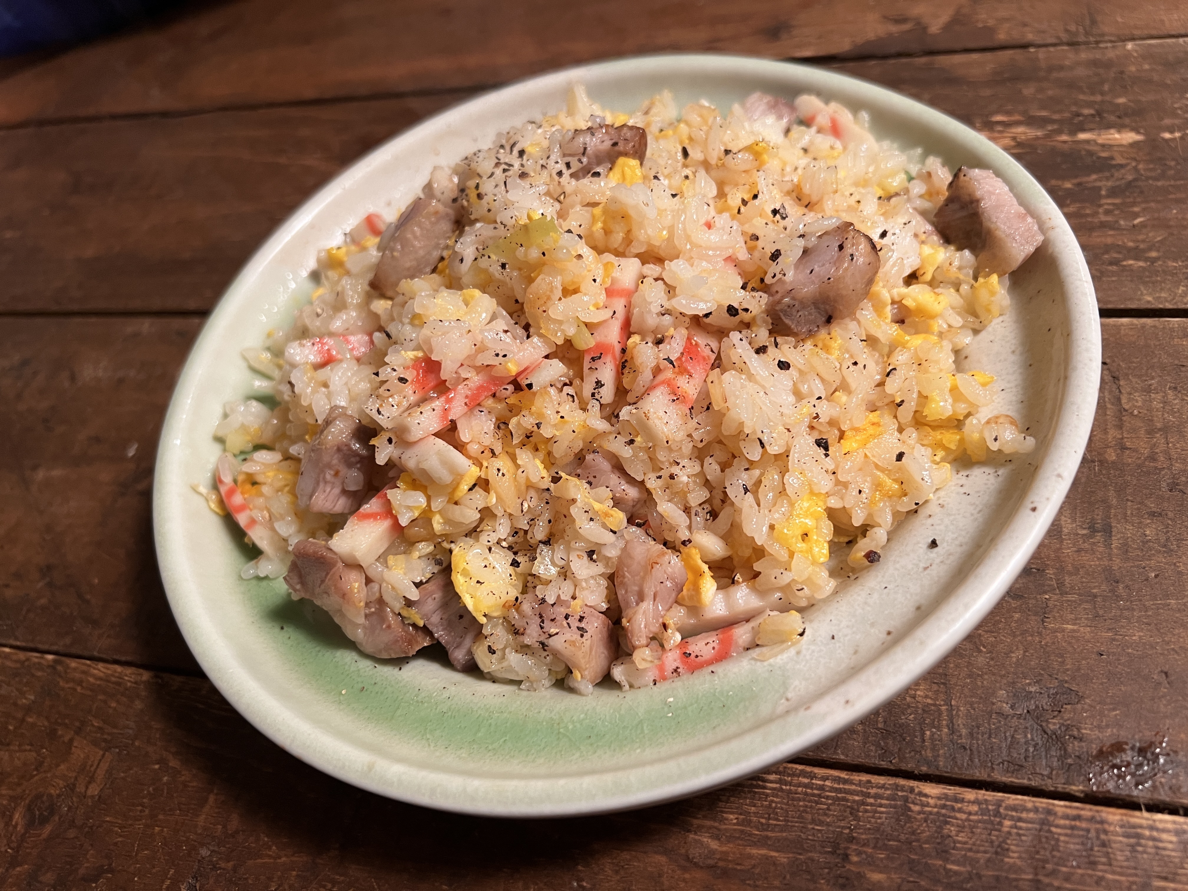3.全体くったりしてきたら、強火で溶いた卵、ごはん、チャーシューの順に入れて炒め合わせる。