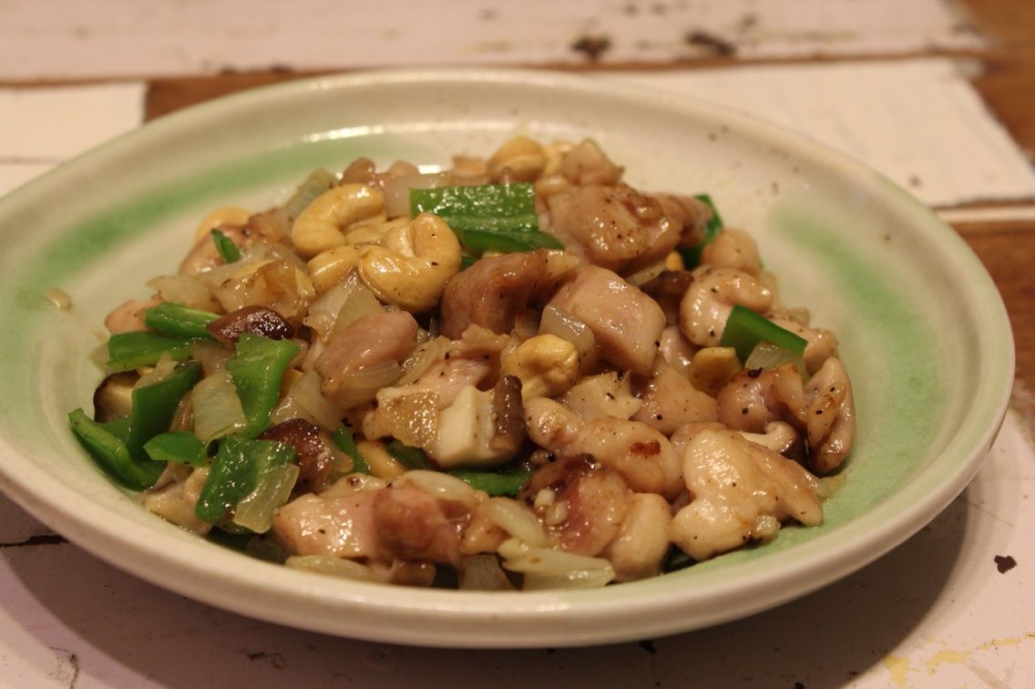 4.中~強火で、鶏肉、たまねぎ、カシューナッツ、しいたけ、ピーマンの順に炒め合わせていく。